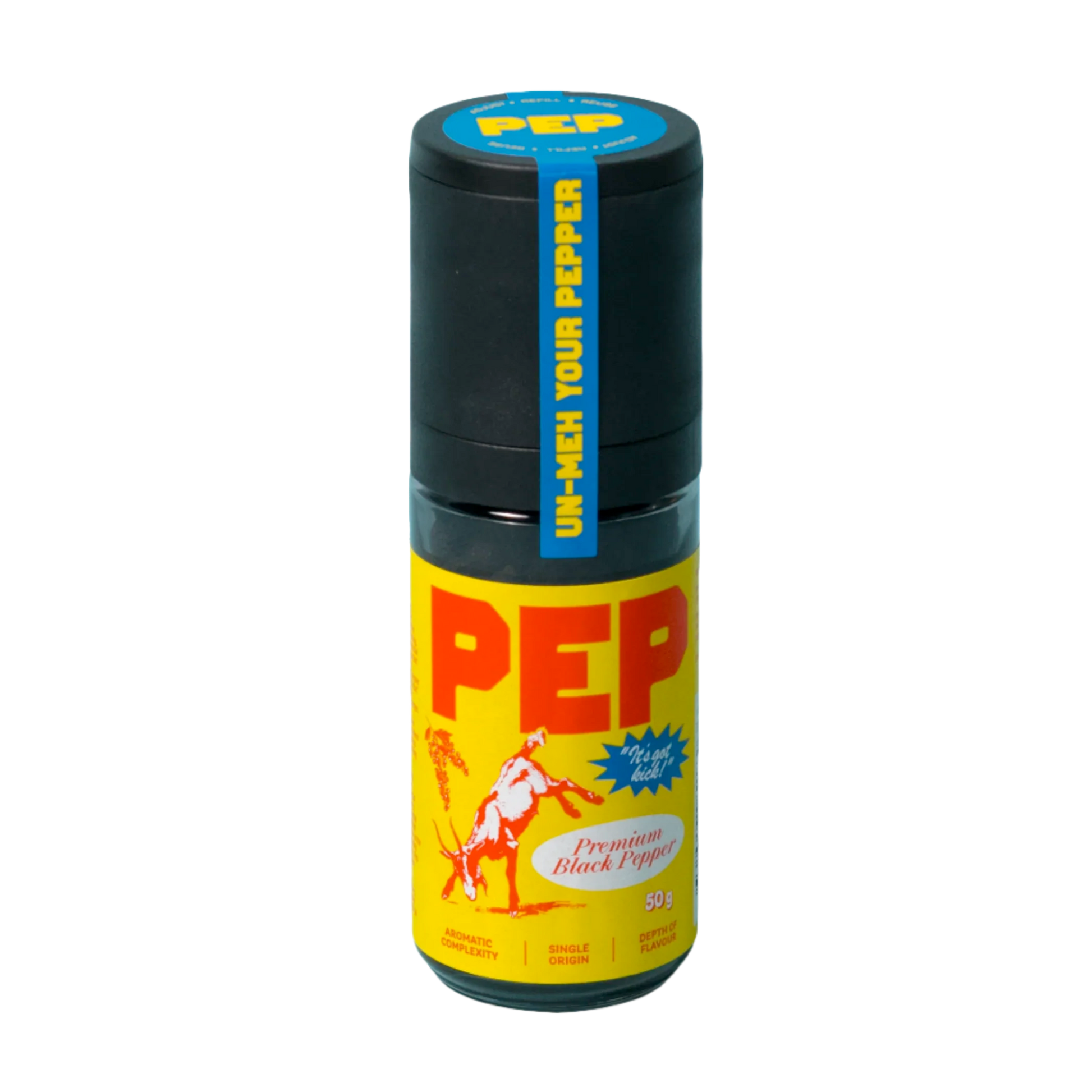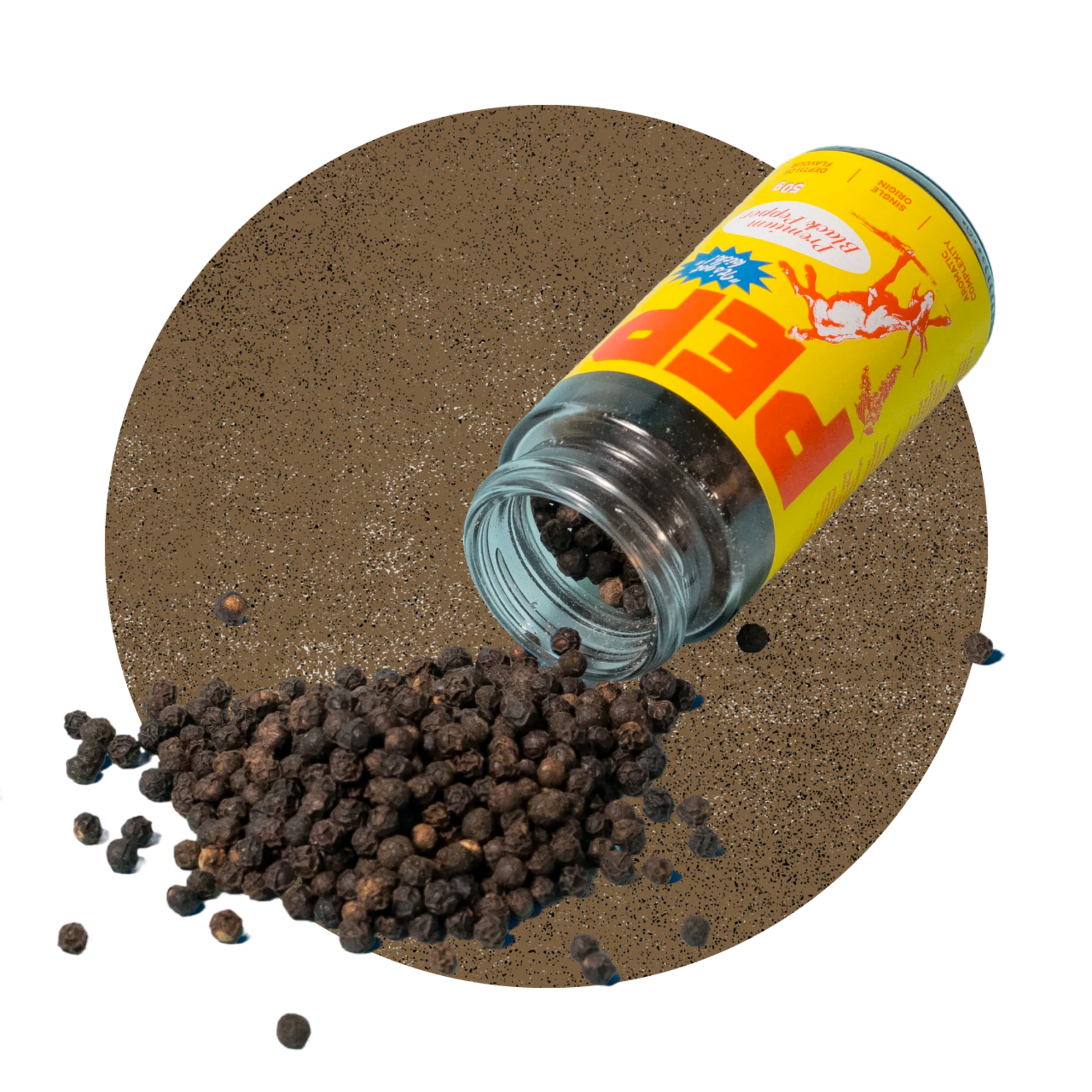 1x reusable smoky glass grinder with 50g of fresh black peppercorns and an adjustable ceramic burr. Grown in beautiful Cambodia.