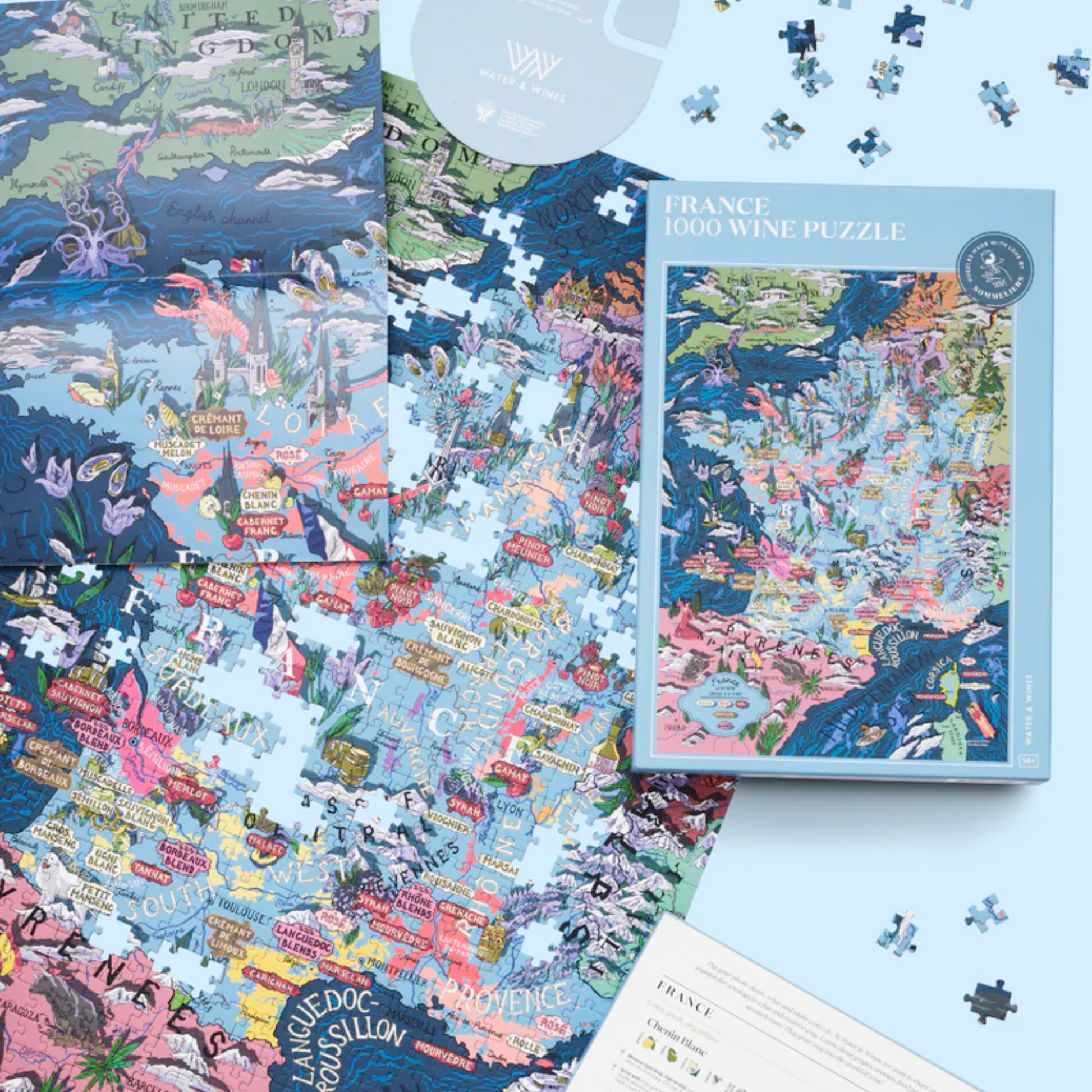 Navigate the grapevines of France, one region at a time with this beautiful hand-drawn jigsaw puzzle. Discover the grapes and star appellations of the iconic regions that have made France one of the most famous wine countries in the world. Expertly curated by sommeliers, the puzzle box features grape profiles that describe the distinct aromas, key characteristics, and food pairing tips of each region.