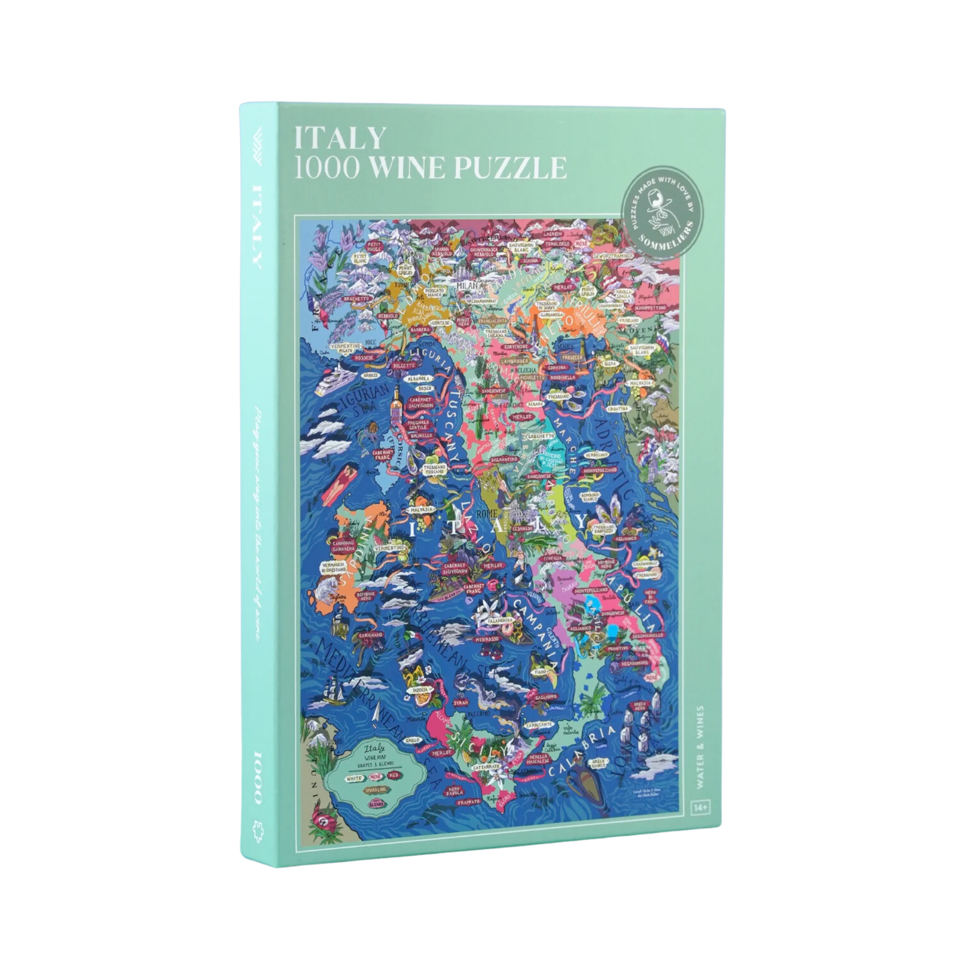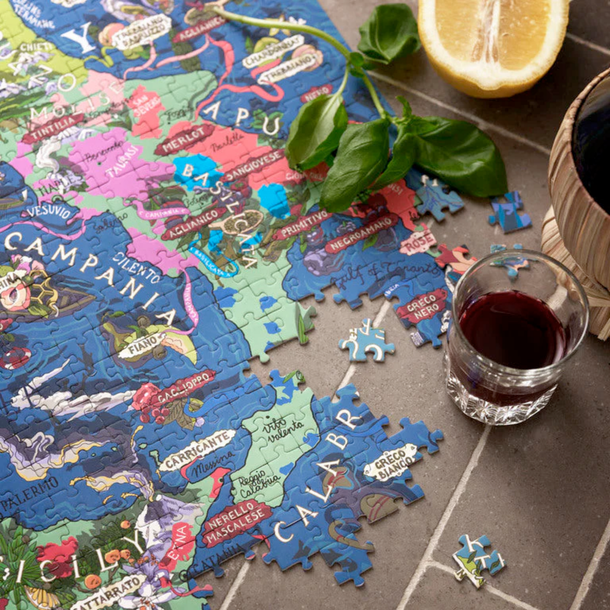 Expertly crafted and beautifully illustrated, this puzzle captures the essence of Italian winemaking by highlighting the grape varieties that have made Italy one of the world's most beloved wine destinations. From Sangiovese to Nebbiolo to Glera, the puzzle features the signature grapes on the map and celebrates their unique aromas and characteristics.
